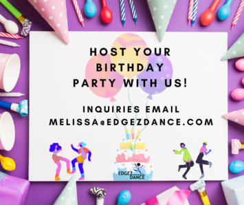 Edgez Dance takes pride in hosting events such as birthday parties, meetings, & rehearsals of all kinds. Edgez Dance provides a 3,000 sq ft facility that is transformed to meet your needs.